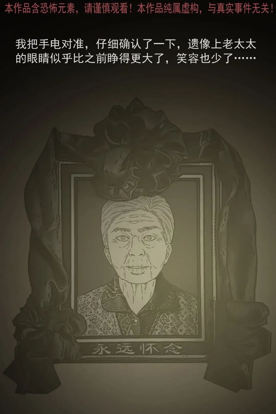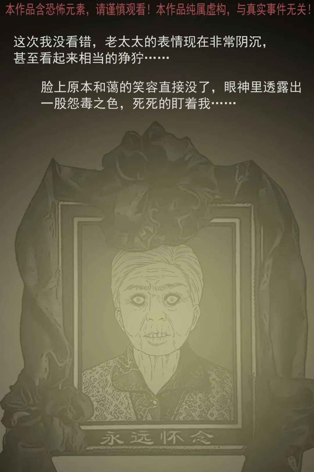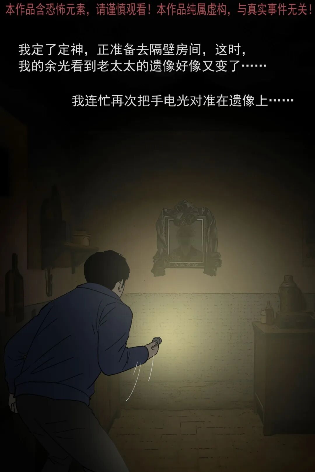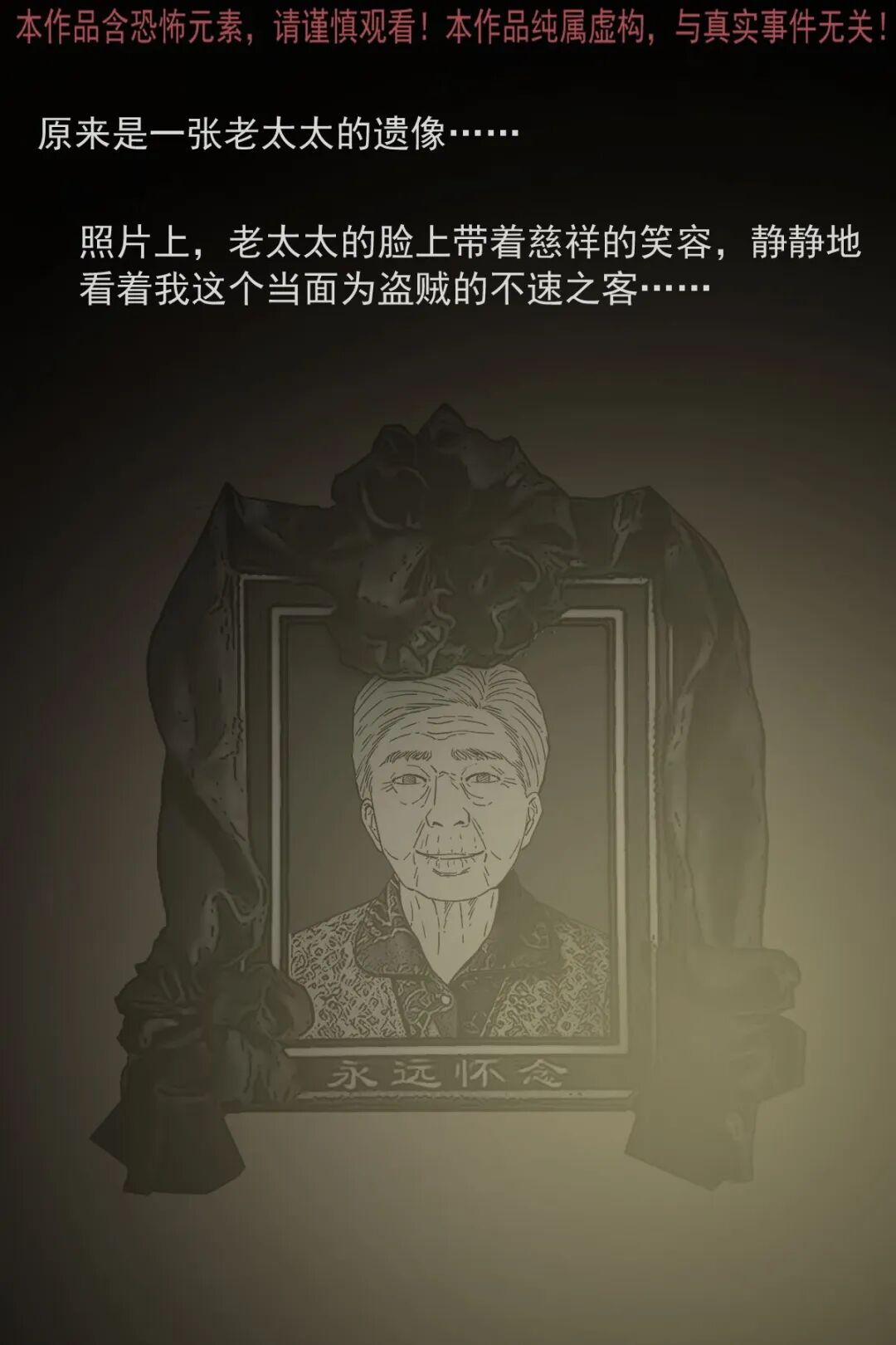辍学后游手好闲的男主,因没钱想去村里刚过世两个月的独居老太太家偷东西,半夜潜入后发现屋内陈设整齐,翻找无果时看到老太太的遗像,起初没在意,后续几次看遗像,发现老太太的表情从慈祥逐渐变得阴沉狰狞,男主吓得认错后退,转身想跑时竟迎面撞见老太太,他惨叫着拼命逃出,此后再也不敢做偷鸡摸狗的事,多年后路过老太太家还会特意拜一拜赔罪