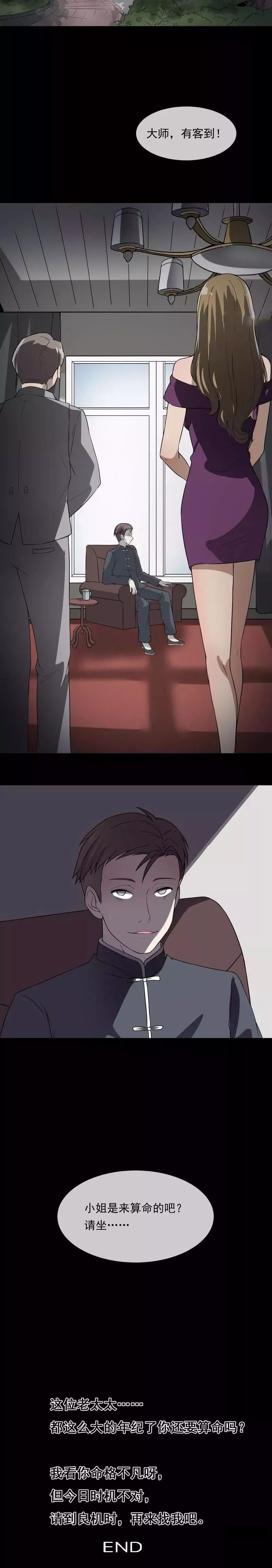 算命师老太太和孙子都不是本人,是借命格奇特的人续命的老妖怪,最后的两句话是倒叙,是老妖怪对来算命的老太太说的,然后老太太就变成了漫画开头的算命师,